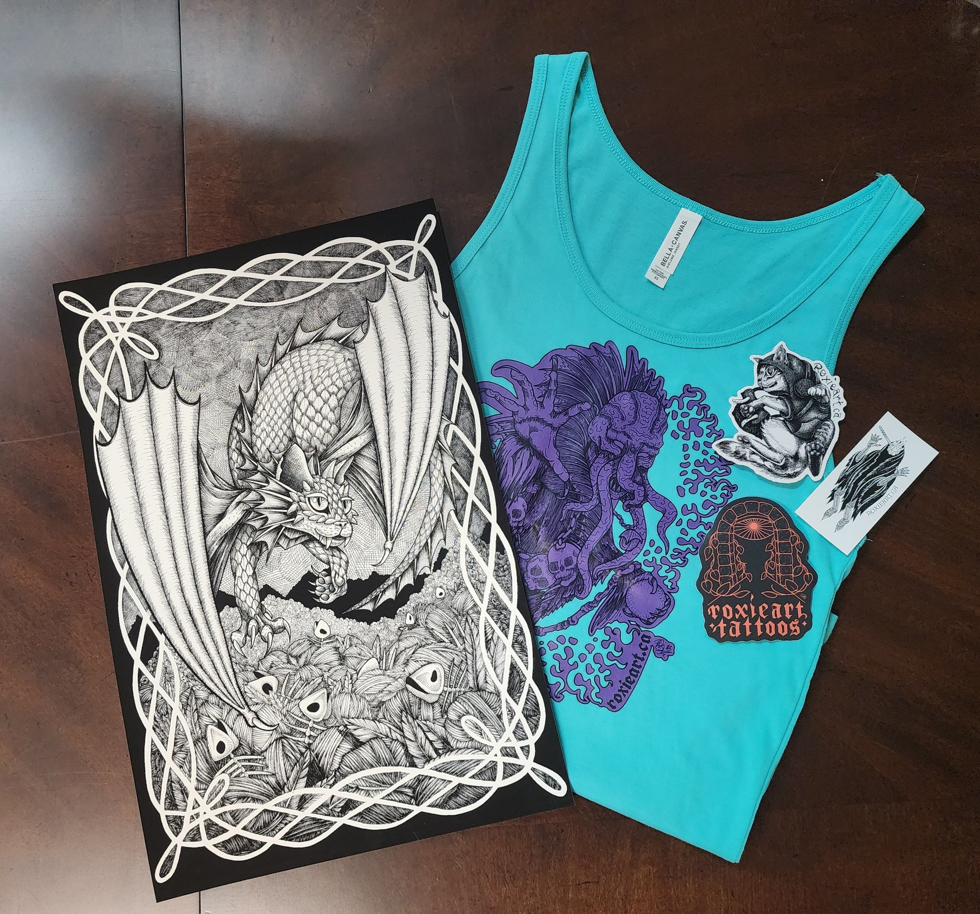 A curated gift bundle by Roxie for the fantasy lover on your list! Includes a Felix Darastix print 11" x 17", Roxie's fantasy stickers, and a Mindflayer shirt or tank top in the size of your choice.