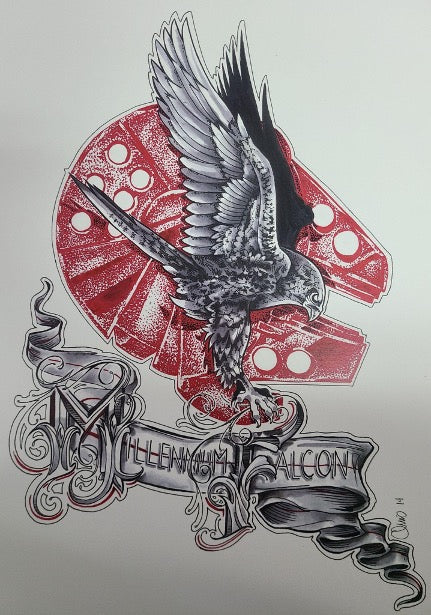 In the background the millennium falcon ship in red, with a falcon in black in the forefront and a stylized banner under that says MILLENNIUM FALCON