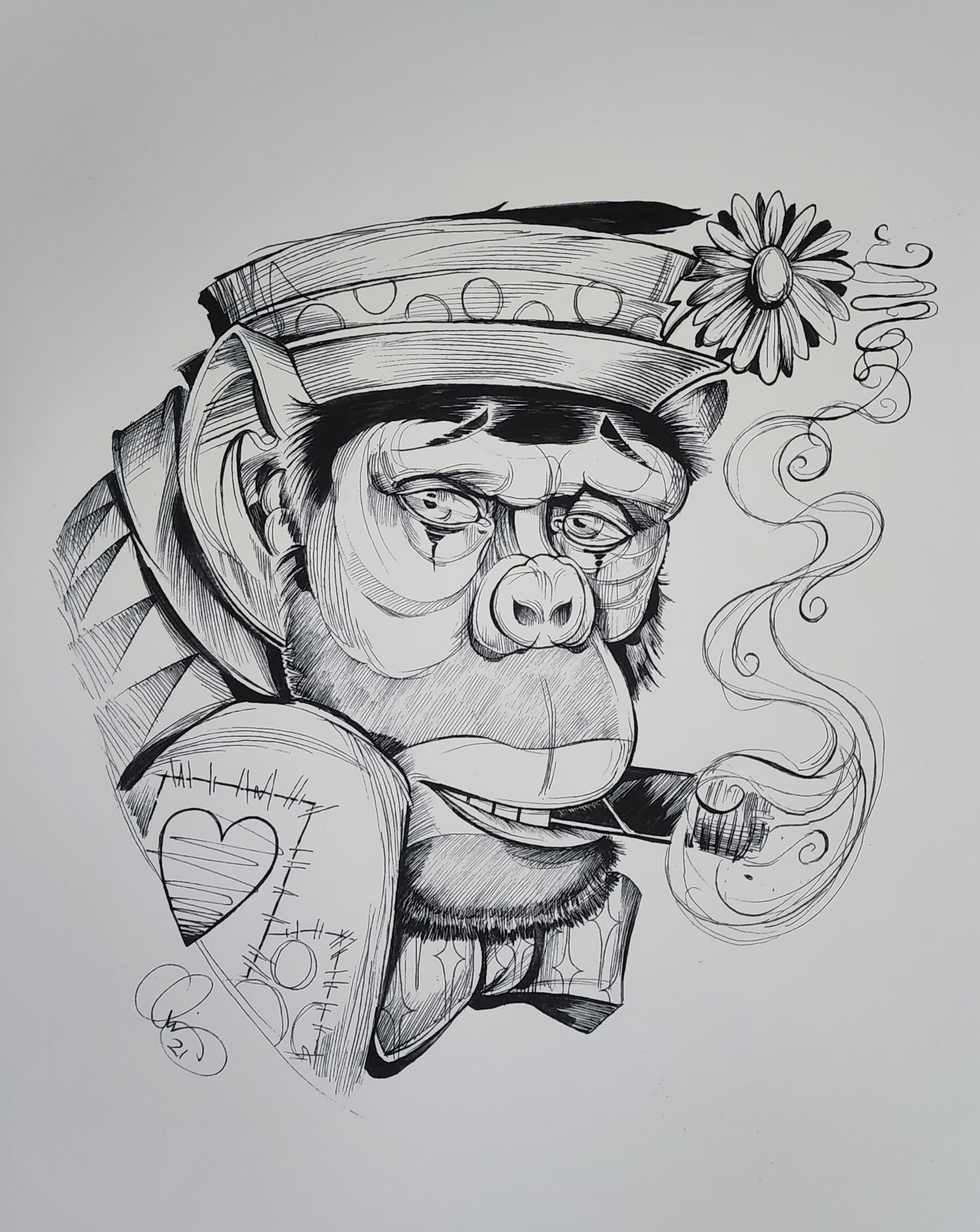 Features a black and grey portrait of a monkey, in a clown costume, smoking a cigar.