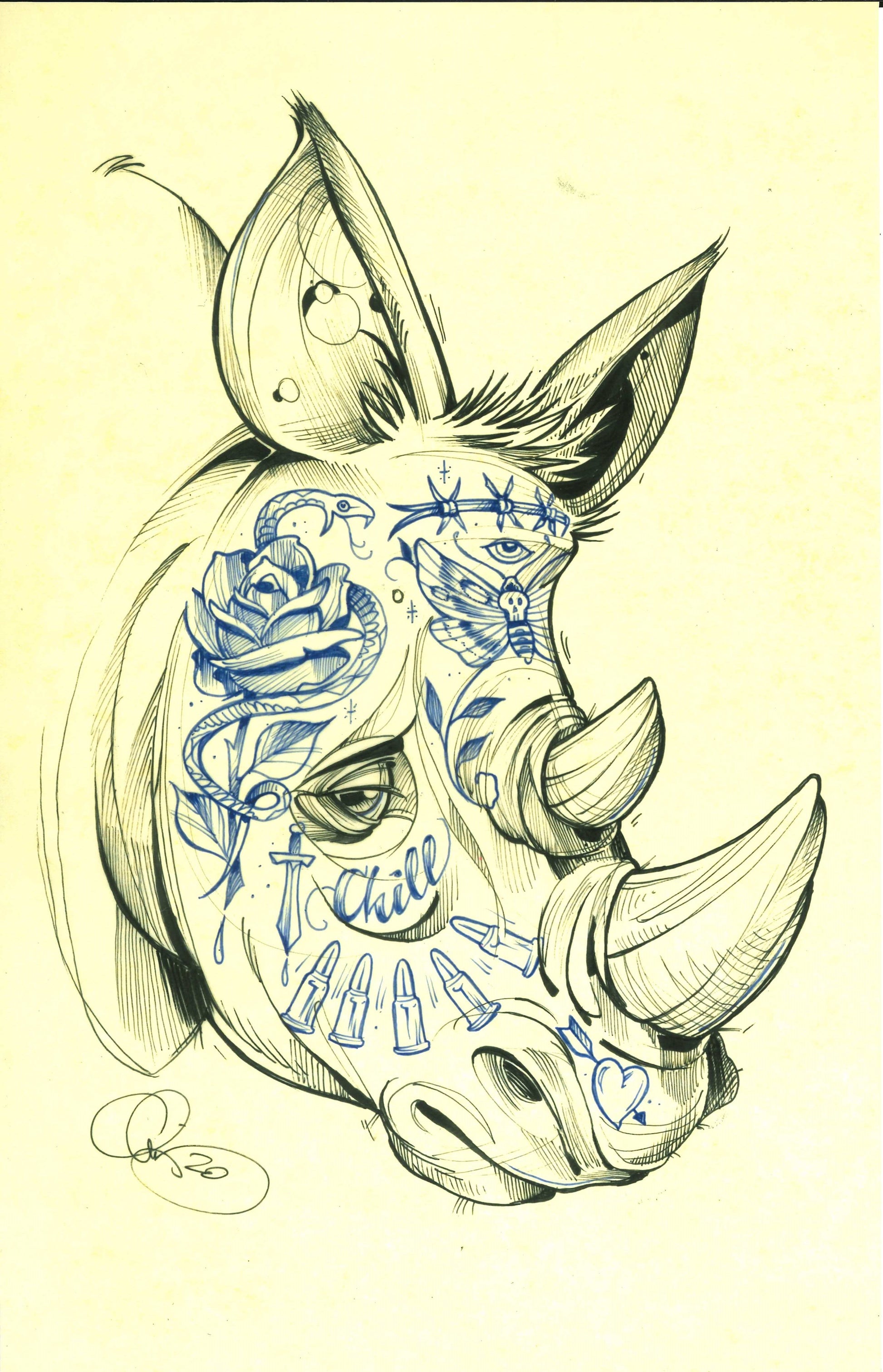 Tattooed linework rhino portrait, teal tattoos on yellow paper.